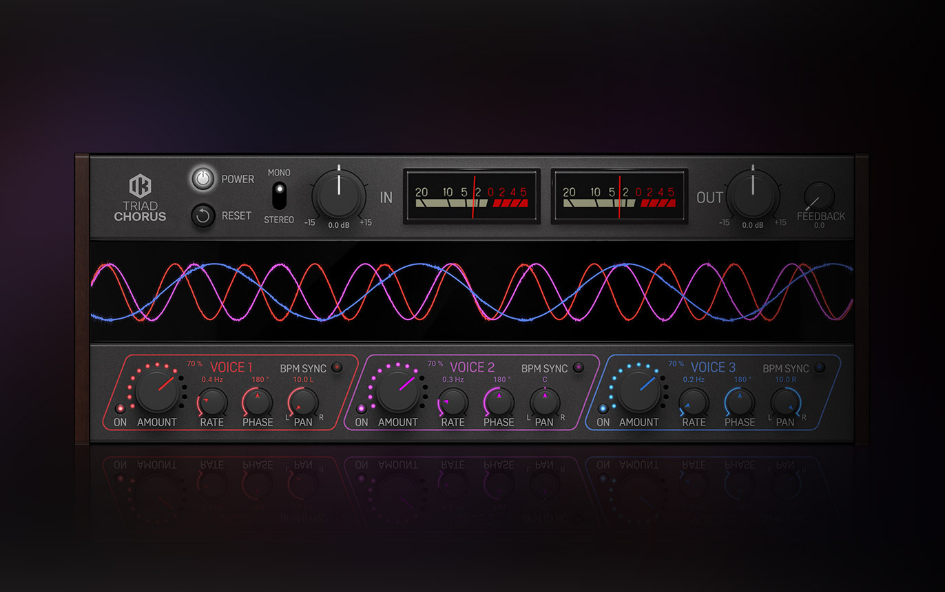 With three chorus voices, each with independent controls for Amount, Rate, Phase, Pan and BPM sync, Triad Chorus offers unparalleled power and creativity. Whether working in mono or stereo, it empowers users to design deep, moving, immersive sounds and textures that were previously unimaginable.