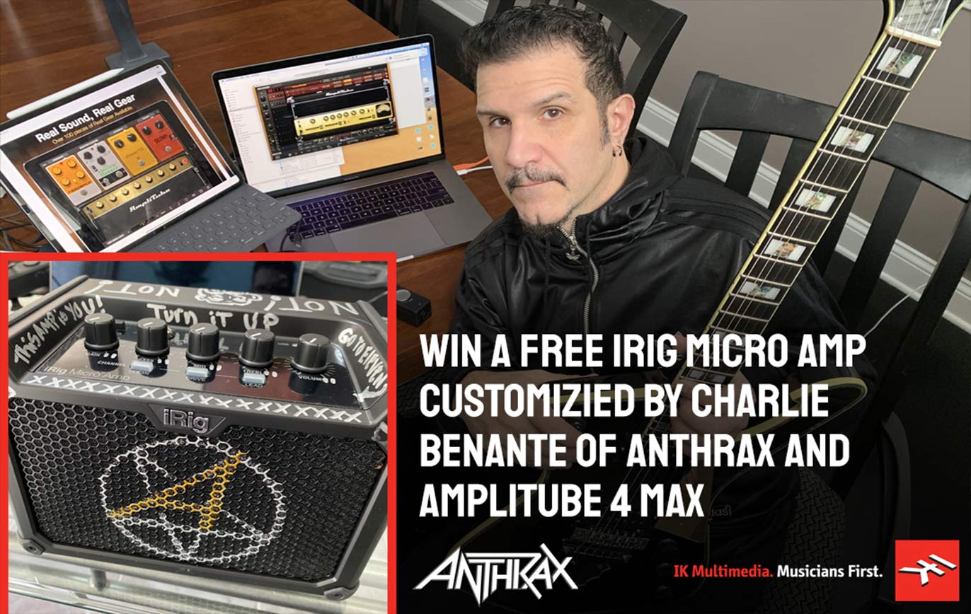 We're proud to announce a new opportunity to win some free gear. We're giving away a free iRig Micro Amp customized (and signed) by Charlie Benante of Anthrax plus IK Multimedia’s AmpliTube 4 Max for Mac or PC!