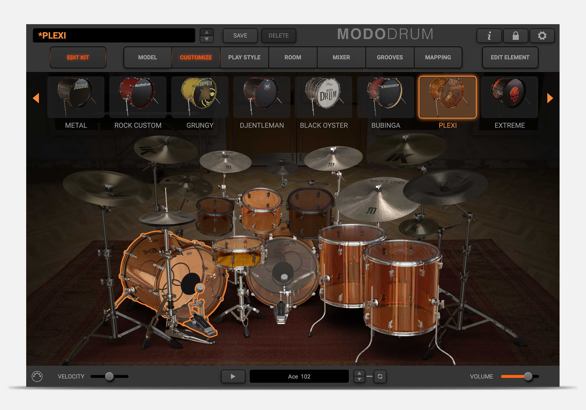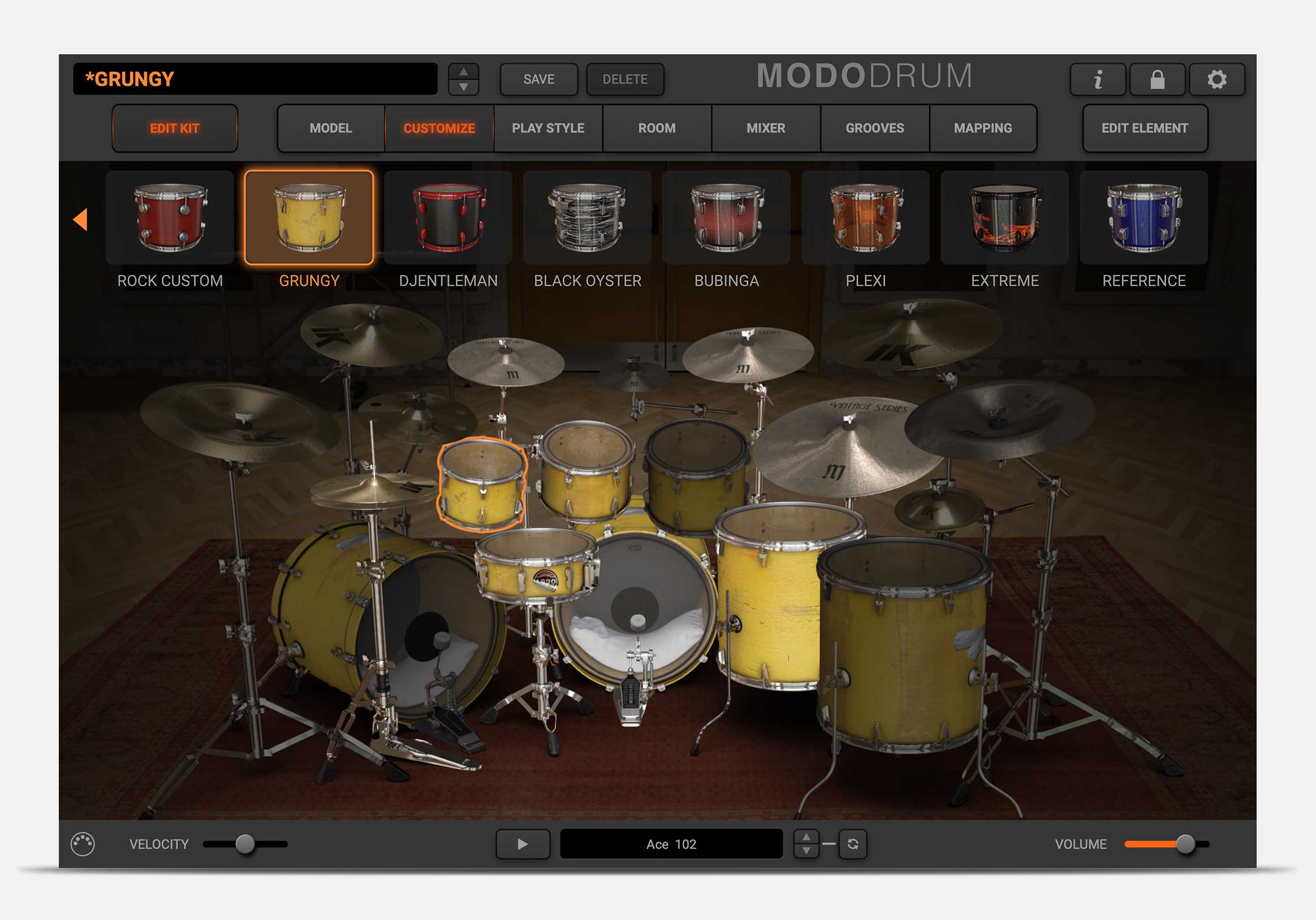 Enter the Showroom and choose one of up 13 drum kits to use as your starting point. From new ones like Silver, Brit Custom and Metal, to Extreme, Grungy, Plexi, and more, each kit has been chosen to represent a particular style, genre or time period, and to give you the widest range of possible timbres and tones.