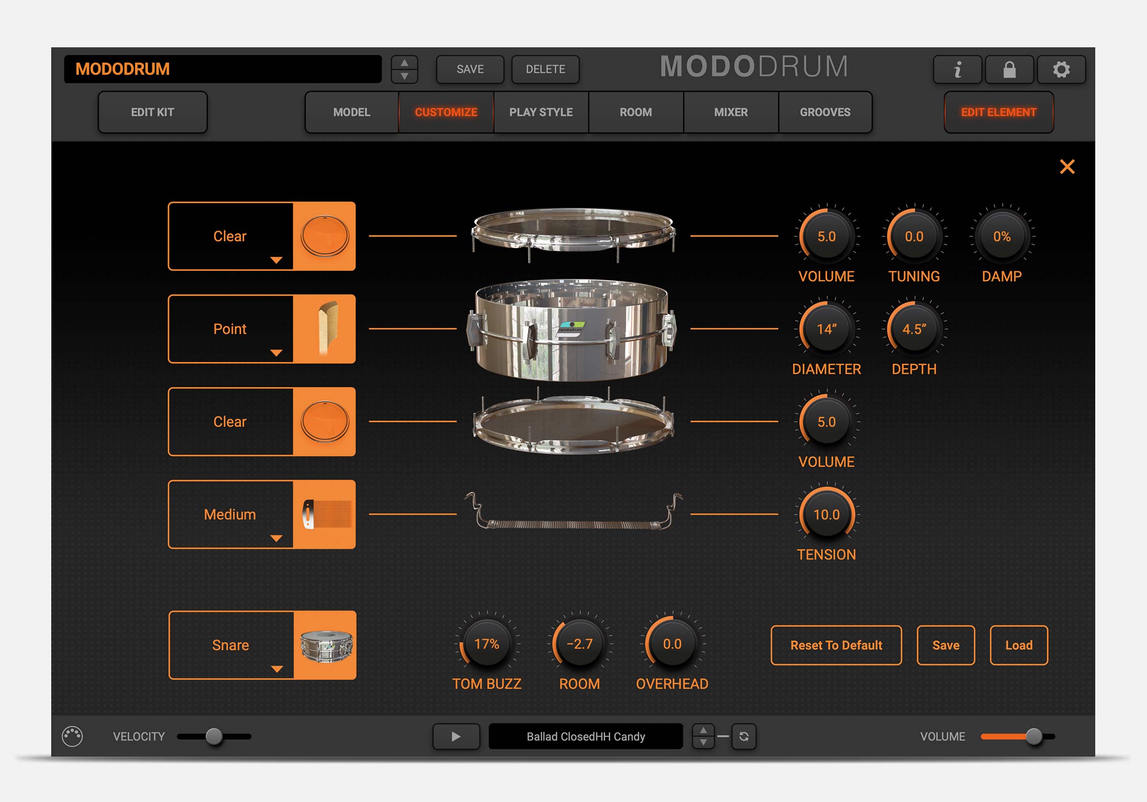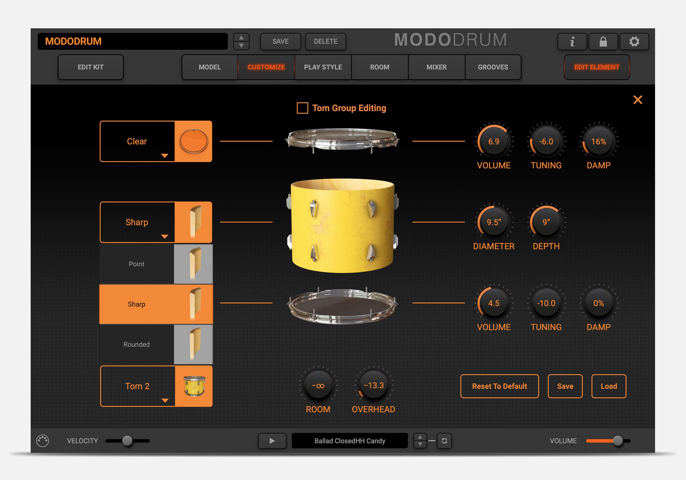 For every drum in the kit, you can adjust the skins, tuning, and damping. Then adjust the diameter, the height and the shell profile of the drum itself.
