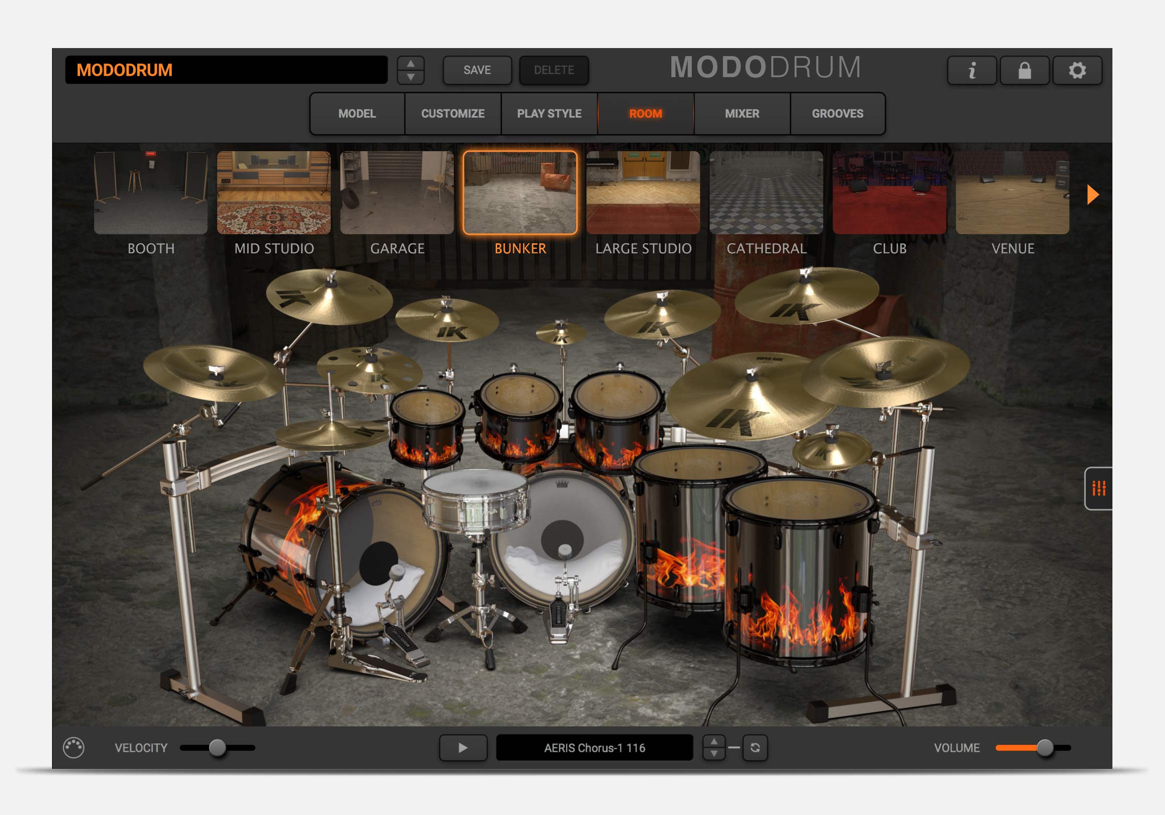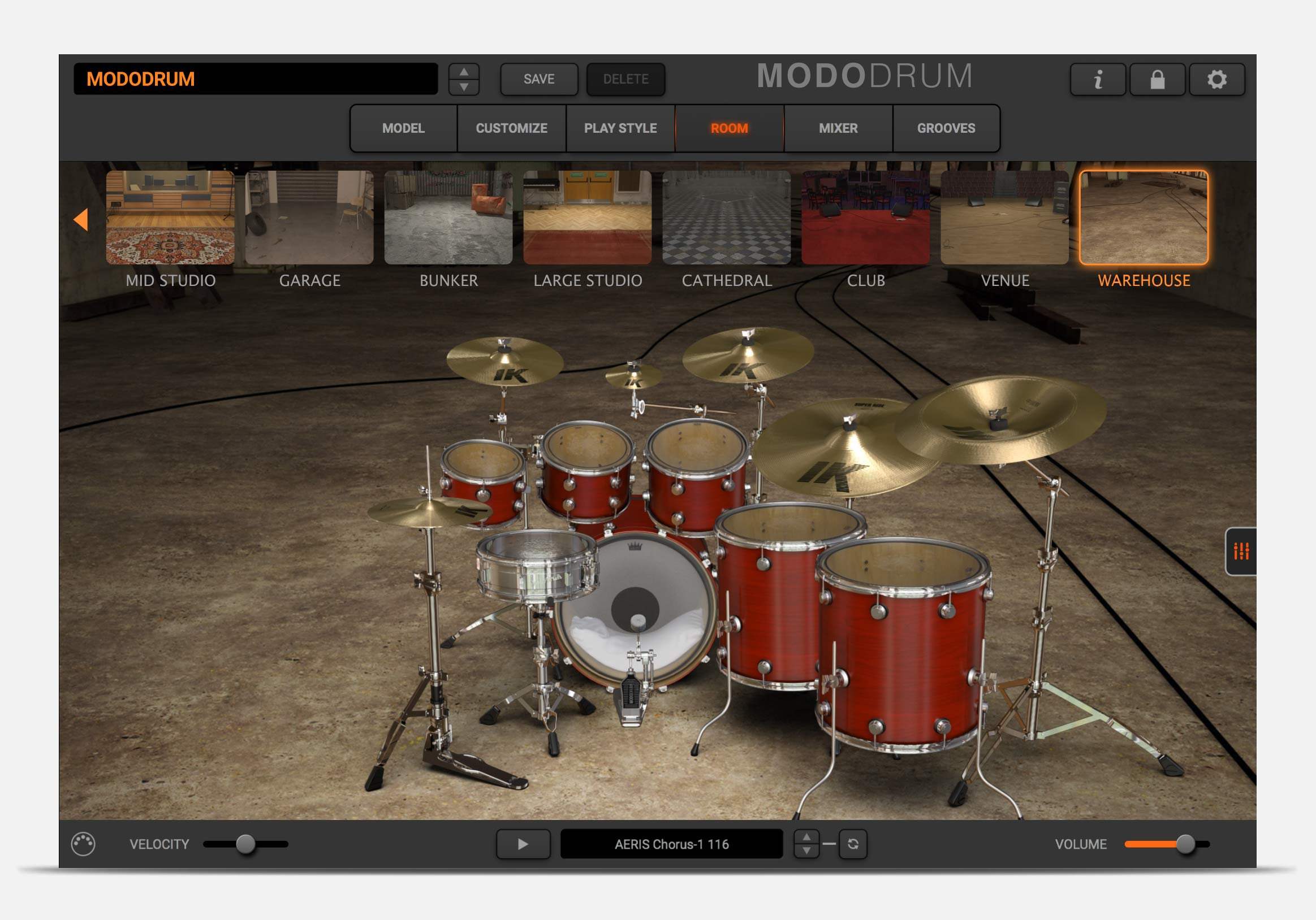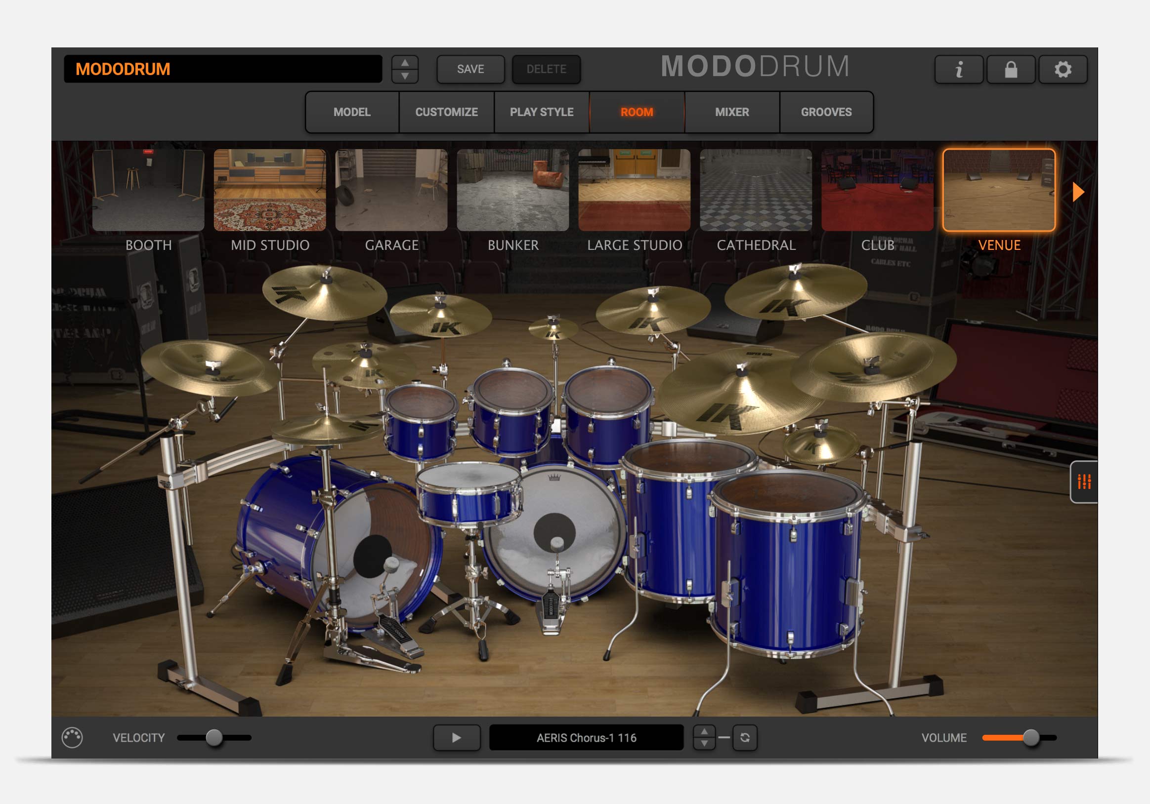 MODO DRUM’s ROOM section lets you place your drums in an array of different environments, from a dry drum booth to IK’s own in-house recording studio, to clubs, cathedrals and more! MODO DRUM uses convolution to ensure each element of your kit interacts naturally with the space and with each other. Let it ring or add gates and compression on the room tone for even more creative drum sounds.