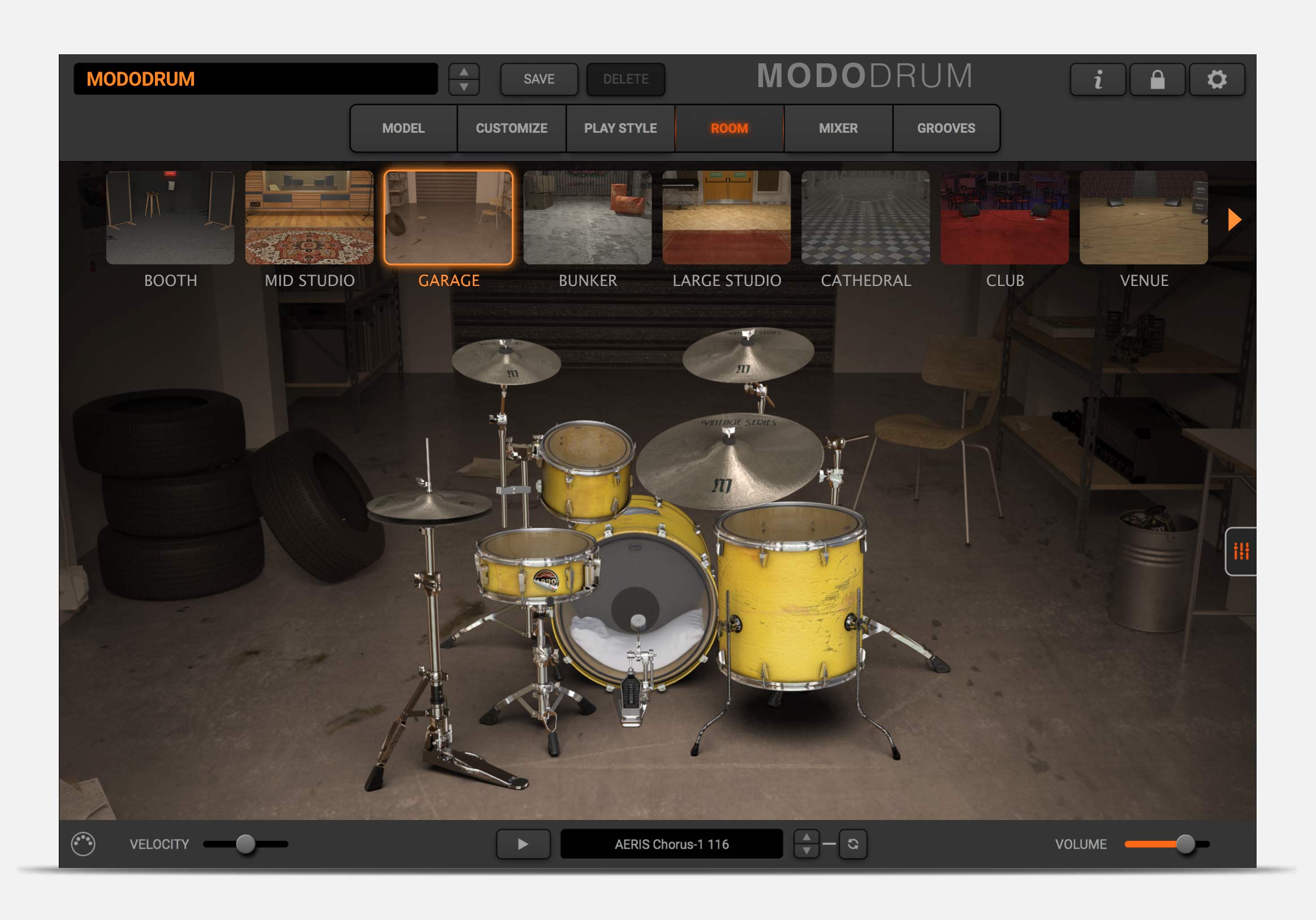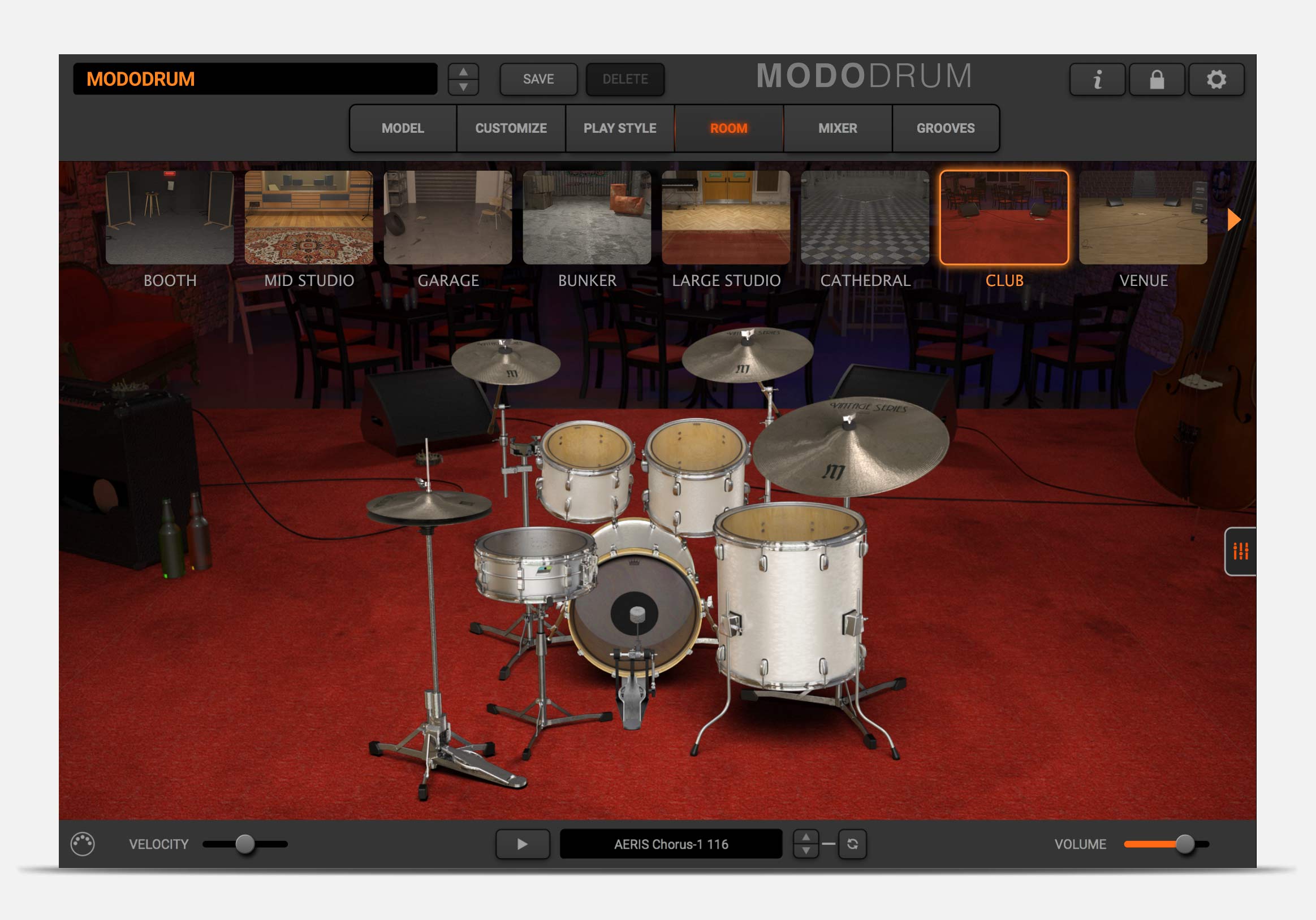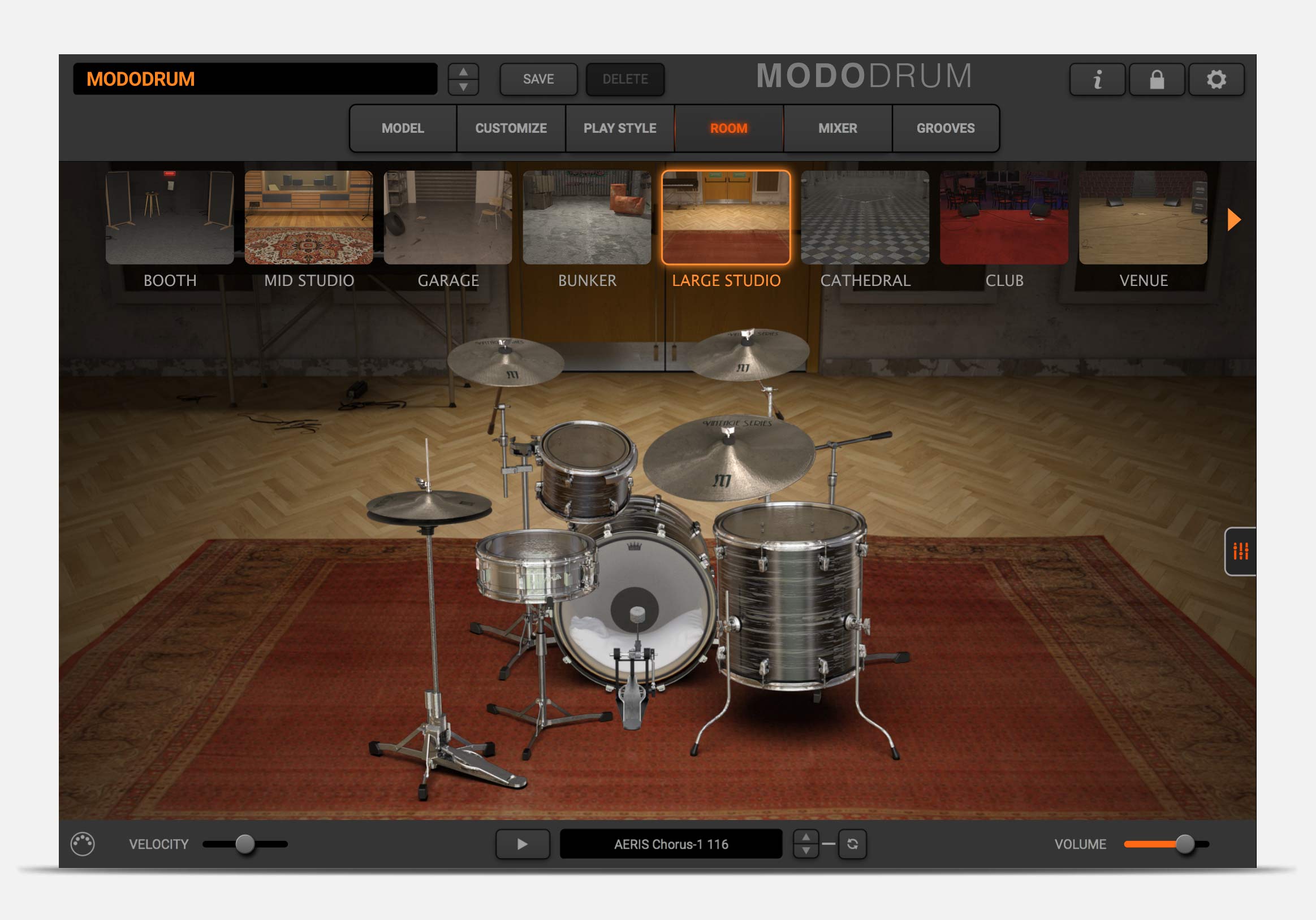 MODO DRUM’s ROOM section lets you place your drums in an array of different environments, from a dry drum booth to IK’s own in-house recording studio, to clubs, cathedrals and more! MODO DRUM uses convolution to ensure each element of your kit interacts naturally with the space and with each other. Let it ring or add gates and compression on the room tone for even more creative drum sounds.