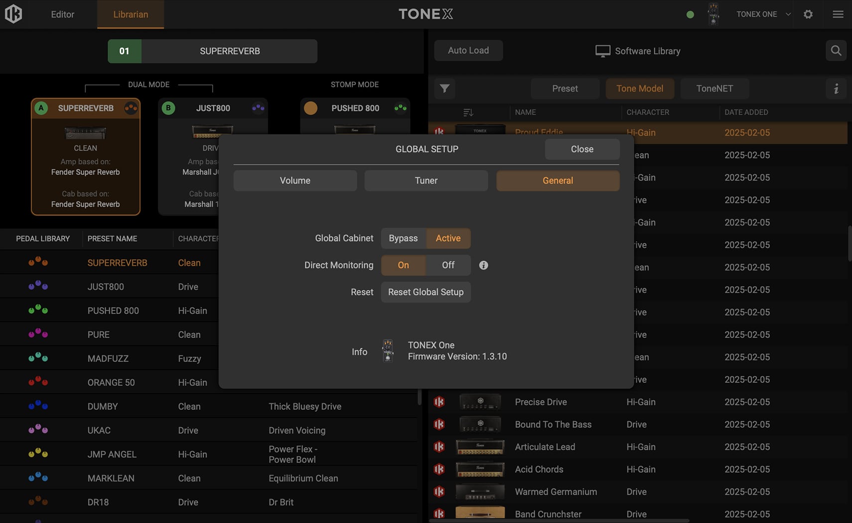 You can directly access Tone Models and IRs stored in both hardware memory and the computer library, streamlining your workflow. A straightforward drop-down menu provides quick access to hardware-stored Tone Models, conveniently sorted by type and character. Additionally, the editor offers full control over all key parameters, including FX, Tone Model Amps, Tone Model Cabs/IR/VIR, and tempo and global setup options, delivering comprehensive, real-time control over all settings.