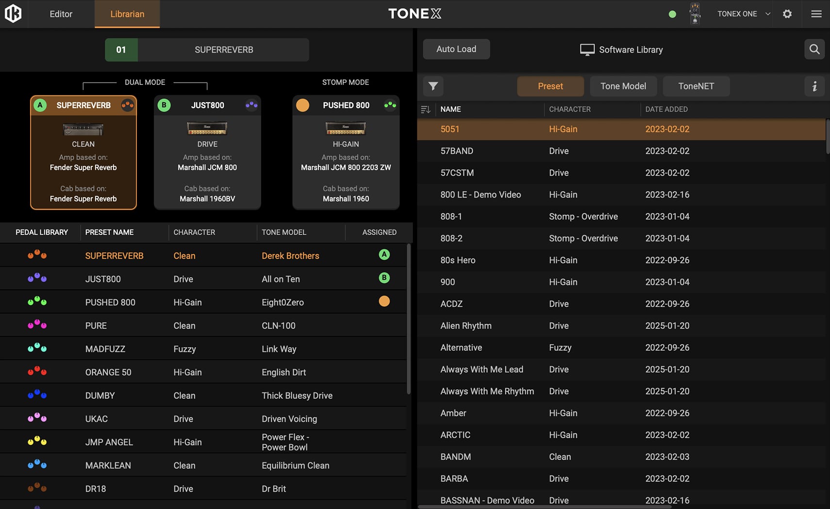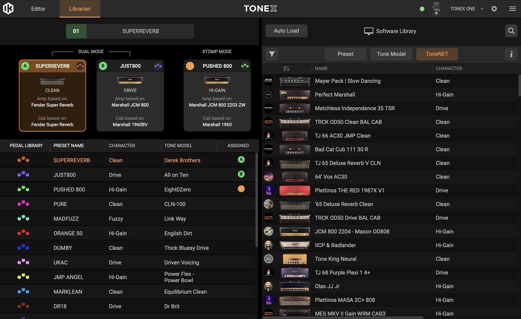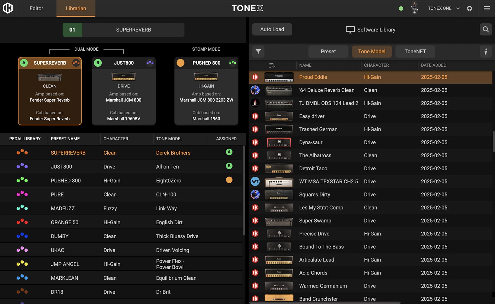 TONEX Editor automatically syncs with your entire TONEX library within the Librarian tab. This allows you to quickly access all your Tone Models, presets and ToneNET, with advanced filtering and folder organization for easy navigation. At the same time, a dedicated auto-load button allows you to preview any Tone Model or preset in a designated hardware slot before committing changes.